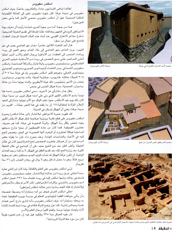 لطالما تباهى اللبنانيون عامة، والعكاريون خاصة، بمولد اسكندر سفيروس في مدينة عرقة، لكن شهرة سفيروس تشير الى العائلة الكهنوتية الملكية الحمصية. فهل أن اسكندر سفيروس حمصي الأصل كما يدعي بعض المؤرخين؟